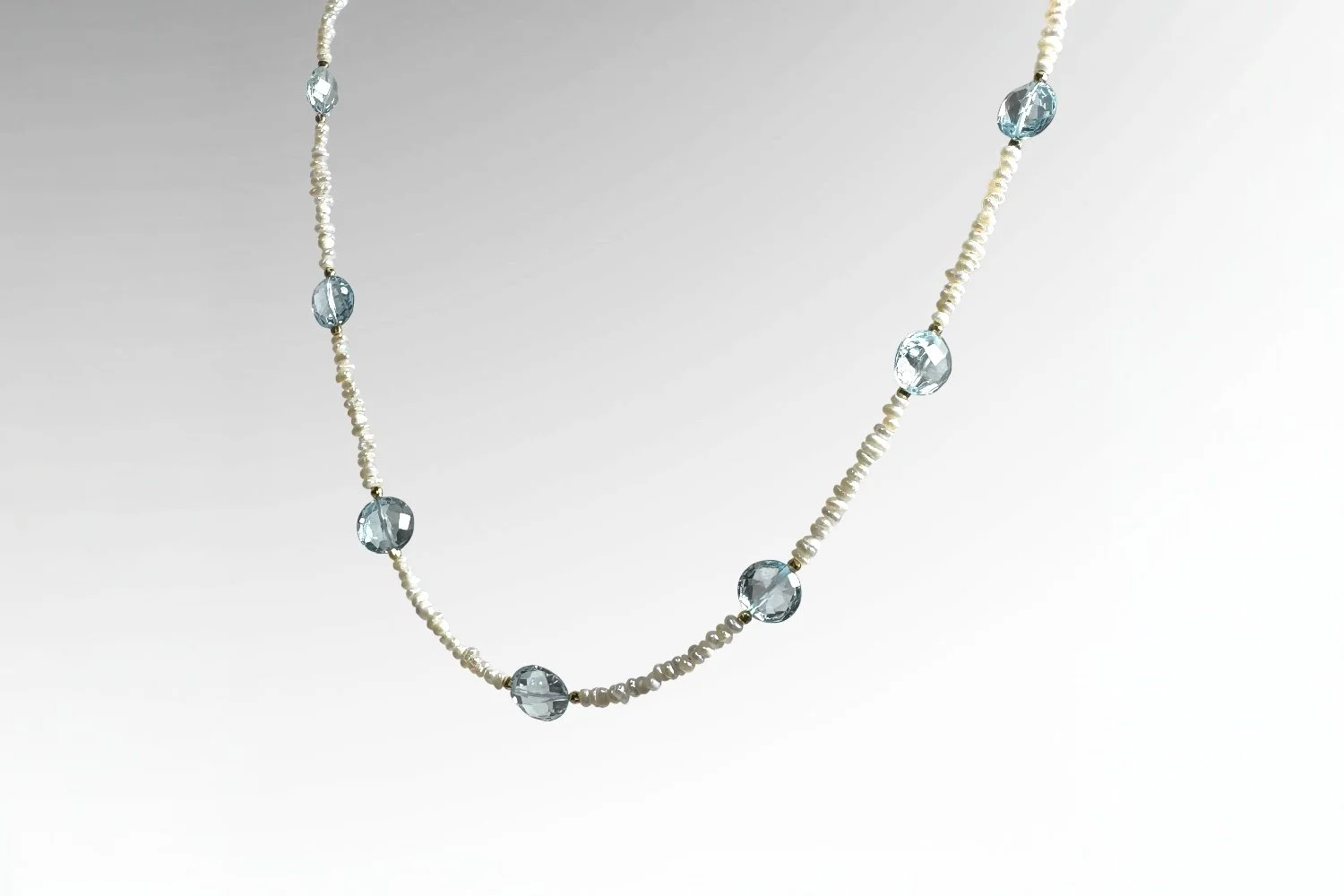 These beautiful earrings by Candy Guerin feature 14K gold and faceted pale blue Topaz stones that sparkle.