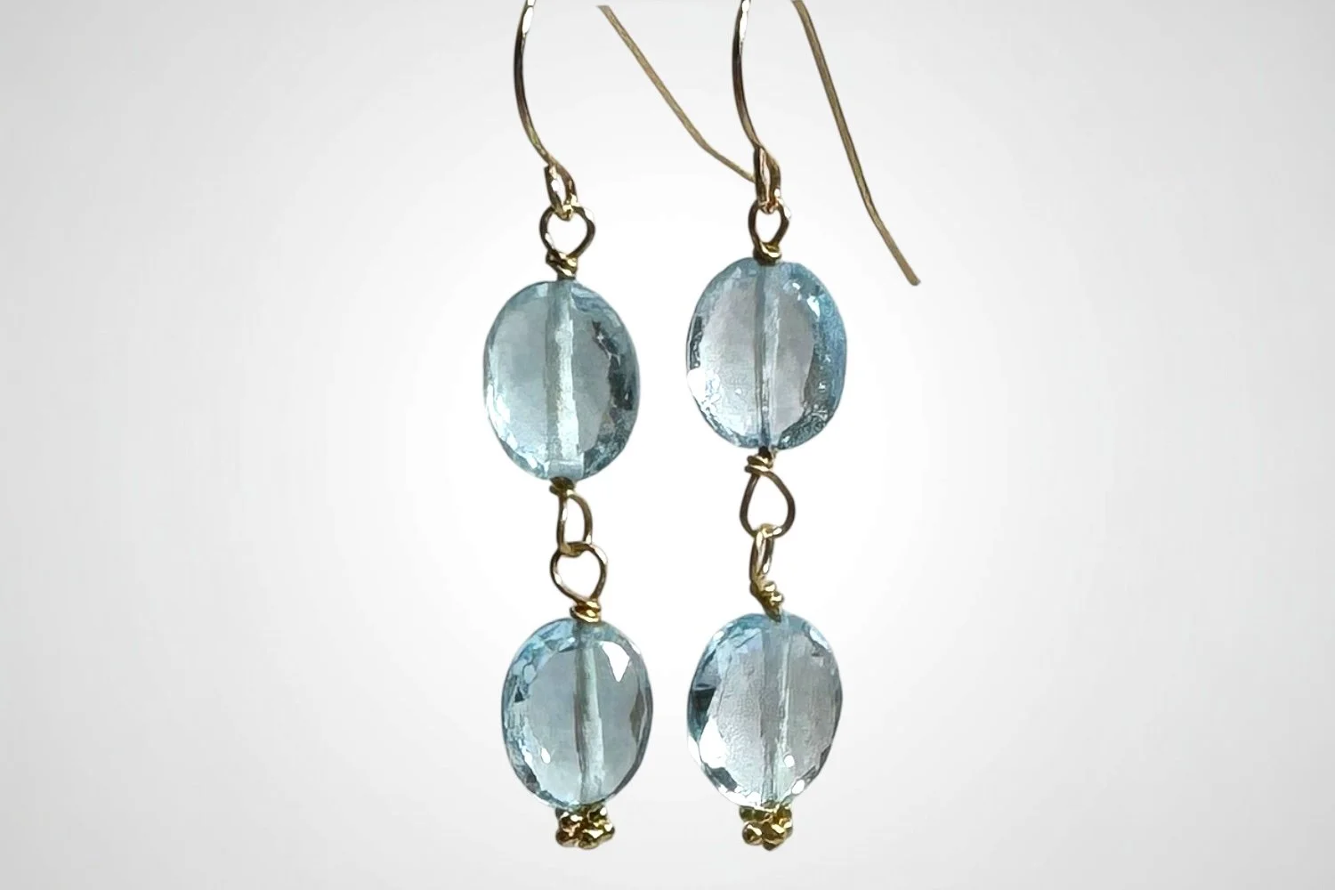 Tiny white fresh water seed pearls and 14K gold beads complement sparkling pale blue faceted blue Topaz stones in this necklace by Candy Guerin.