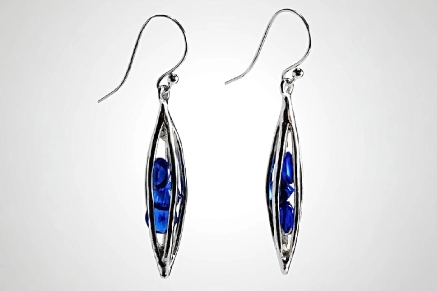 This striking pendant by Betsy Frost features small faceted cobalt blue glass beads inside a sterling silver cage.
